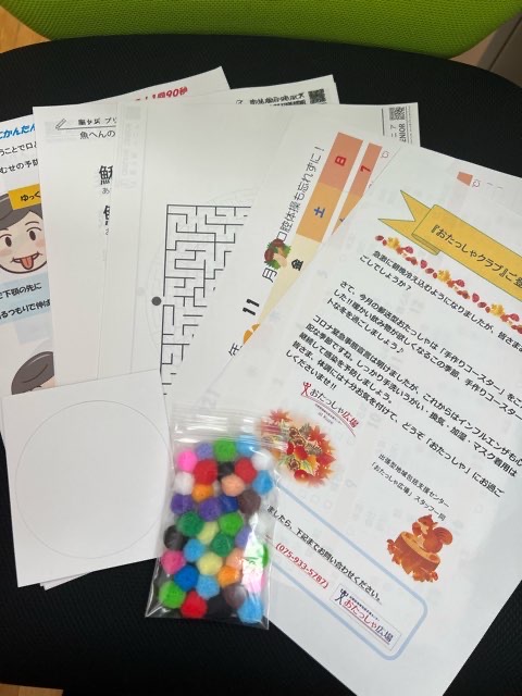 みなさん!こんにちは!   昼は暖かいですが、朝晩は寒くなりましたね。 体調崩していないですか? さて、今回の10月の郵送型おたっしゃは盛りだくさん!! ・脳トレ ・座ってできる体操 ・口腔体操 ・食事の栄養アドバイス ・測定カレンダー ・工作はポンポンを貼り合わせて作るコースターです。 どの色を合わせるか考える事も楽しかったです! ぜひ皆さんも作ってみてください。