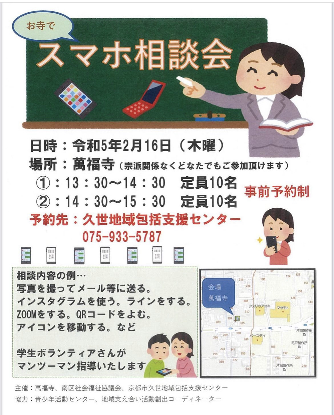 久世大藪町 萬福寺様 @jigenzan_manpukuji を会場にして、 シニア向けスマホ相談会を開催します❗️ LINEをうまく使いたい✨ 写真を撮って送りたい✨ Instagramを見たい✨ などなど‥ その他、些細なことでも、ぜひ一度ご参加ください🌈 お寺見学、素敵なお庭で写真撮影も出来ます🥰 ご興味ある方はぜひ、久世包括までお問い合わせください🙆‍♀️ 学生ボランティアさんと一緒に、お待ちしております💫