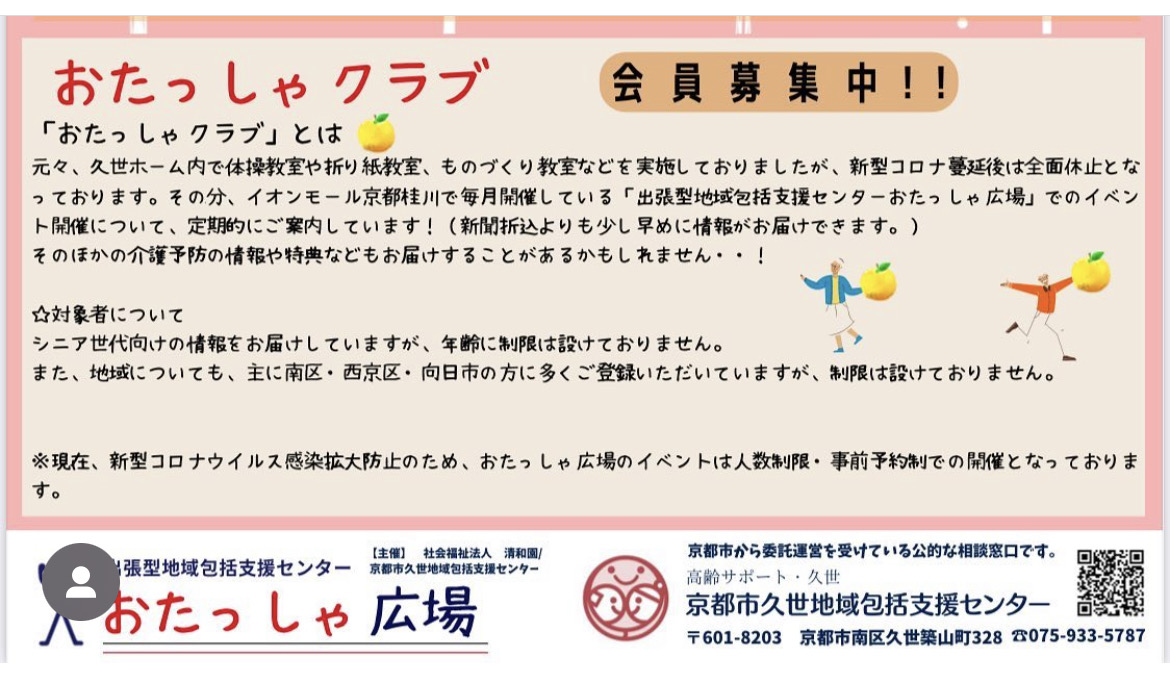 久世包括では、「おたっしゃクラブ」という会員登録制の情報発信を行なっています‼️ 現在登録いただいている方は330名ほど🥰 久世包括からの介護予防の情報、イオンモール京都桂川で開催しているおたっしゃ広場の情報が毎月届きます🌈 介護予防の意識を皆さんに持っていただきたいという思いと、必要な時にすぐに地域包括支援センターを思い出してもらえるように‥という思いで、立ち上げたものです✨ 娘さん、息子さんから勧められて会員登録したという方もいらっしゃいます😊‼️ ご興味ありましたら、お問い合わせください🙆‍♀️