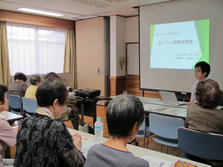 こんにちは、久世地域包括支援センターの畑中です! 10月のおたっしゃ学習クラブのご報告です。 第一木曜日の10月6日、 消費者被害について、地域の皆様と勉強会を開催いたしました。 今回、講師としてお越しいただいたのは、 弁護士の伊吹健人先生です。 伊吹先生からは、 特に最近多い消費者被害やその対処法・予防法、困った時の相談先 などを教えていただいたのですが、 参加者の皆さんは『うんうん』と頷きながら、聴いておられました。 また、伊吹先生は、 『京都消費者契約ネットワーク』という団体にも所属されており、 消費者を代表し、その権利・利益を守るために 企業に対して不当な活動を止めるよう、求める活動をされています。 その活動内容についても詳しくご紹介いただき、とても勉強になりました。 何気ない日常生活で起こりうる消費者被害! 自分は大丈夫と思っている人こそ被害に遭いやすいものです。 あやしいな…おかしいな…と疑うことが必要ですね。 そのためには、まずは「知る」ことから始めなくてはいけません。 今回のクラブで、 その「知る」という機会を作ることができたのかな? と少し感じました。 今後も定期的に学習クラブを開催いたしますので、 ご興味のある内容があれば、ぜひご参加くださいませ。 京都市南区の介護・介護予防の市民相談窓口 出張型地域包括支援センター おたっしゃ広場
