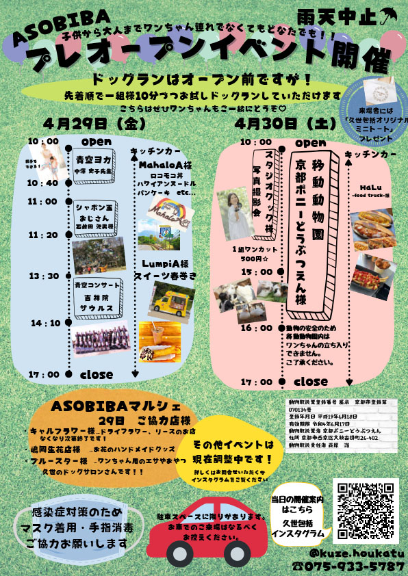 【4/29〜4/30開催】久世ホームドッグランASOBIBA プレオープンイベントのご案内