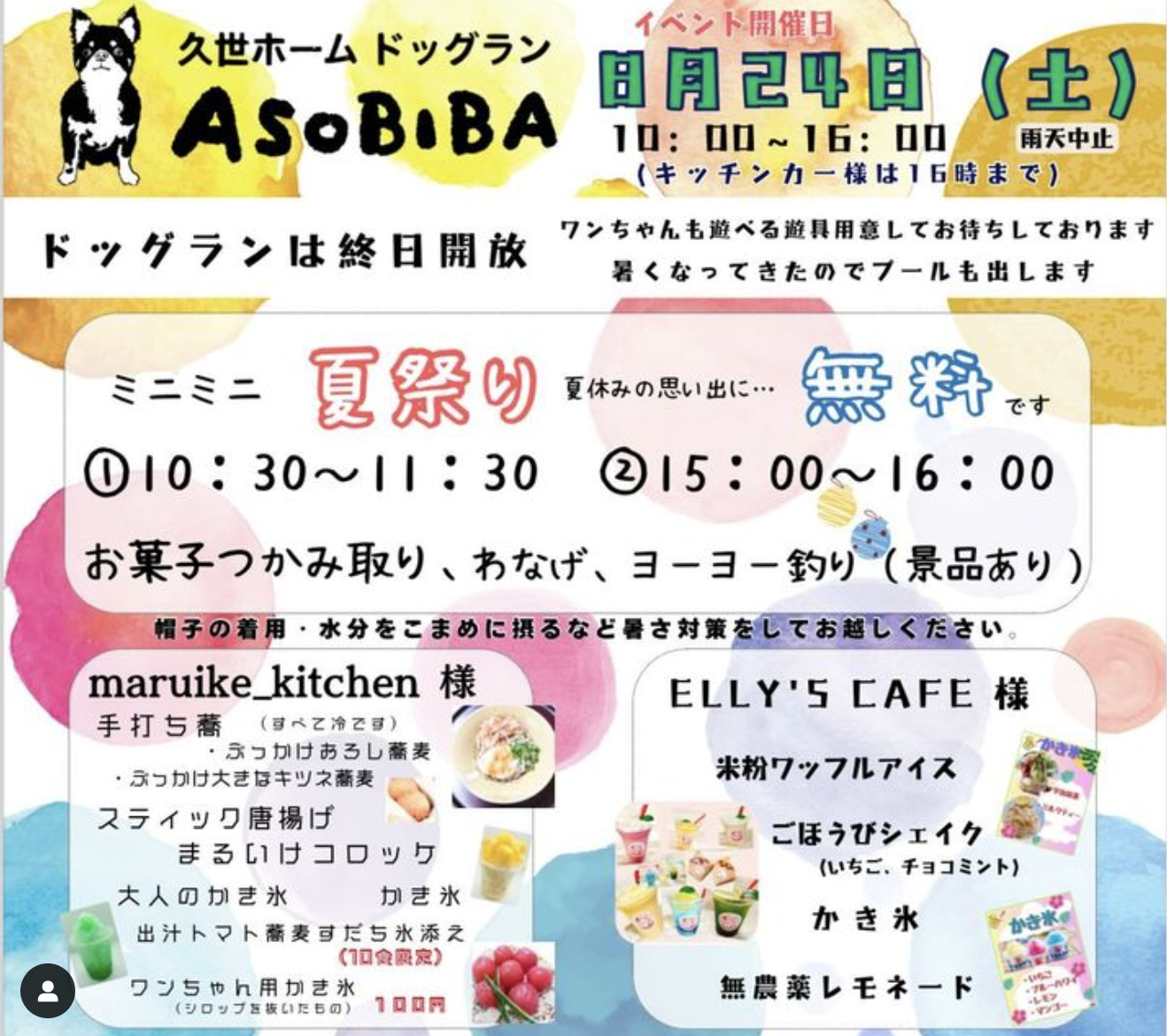 久世ホームドッグランASOBIBAからのお知らせです💭 今月は8月24日(土)にイベント開催いたします🌻🤍 ミニ夏祭り第2弾を実施予定です✨ ★ミニ夏祭り 10:30〜11:30/15:00〜16:00 ※2部制です お菓子のつかみ取り🍭🍫、ヨーヨー釣り、わなげなどを実施予定です🥳 ご予約は不要ですので、各時間帯でご自由にご参加ください☺️ 今回出店してくださる皆様は...✨ 〈キッチンカー〉 maruike kitchen様 @maruike_kitchen 様 ELLY'S CAFE様 @ellyscafe2020 様 ご紹介はこれからしていきますのでお楽しみに🥰 ================================= 💻HPは【久世ホームドッグラン】で検索💫 プロフィール欄URLからもアクセスできます🤗 @asobiba_kuzeh.dogrun イベントのご案内は久世地域包括支援センター @kuze.houkatu ホームページにも掲載しています🎉 🐶ご利用予約•会員登録は☎️075-933-5787にお電話もしくは、直接久世ホームまでお越しください🐶 #京都市 #南区#社会福祉法人清和園#久世 #夏祭り #キッチンカー #お店 #ワンちゃん#野菜 #販売 #出店 #出店者募集中 #地域包括支援センター #コラボ #つながり #食べ物 #ご飯 #デザート #メッセージ #お待ちしています #イベント #企画 #seiwaen_promotion