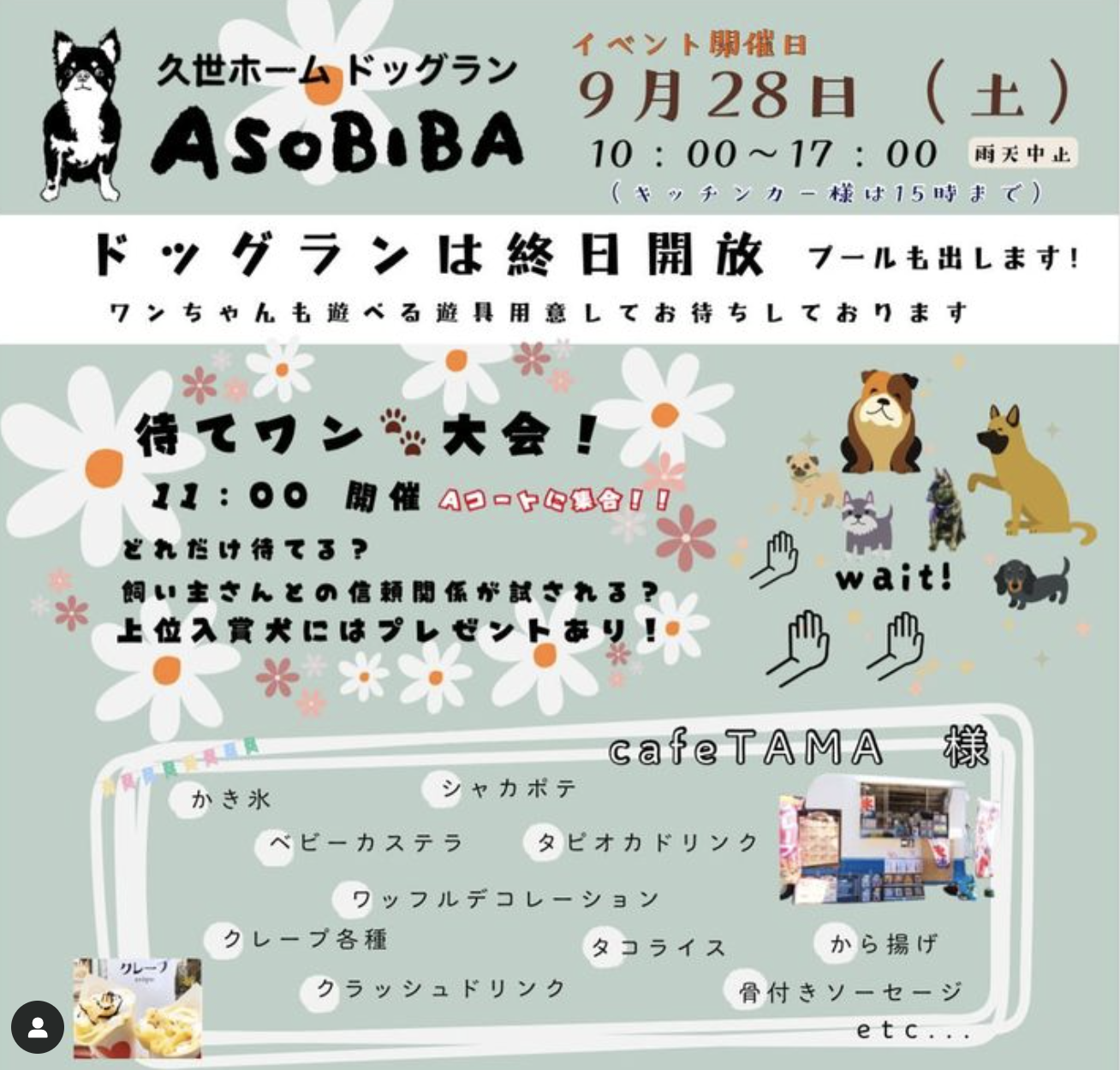 久世ホームドッグランASOBIBAからのお知らせです💭 今月は9月28日(土)にイベント開催いたします🍁 今回は、待てワン大会を行います🐶 上位入賞犬にはプレゼントもございます🎁 11時から開催しますので、11時にAコート集合でお願いいたします🐾🤍 ご予約は不要ですので、お気軽にご参加ください😆 今回出店してくださる方は...✨ 〈キッチンカー〉 cafeTAMA様 @cafe.tama 様 ご紹介はこれからしていきますのでお楽しみに🥰 ================================= 💻HPは【久世ホームドッグラン】で検索💫 プロフィール欄URLからもアクセスできます🤗 @asobiba_kuzeh.dogrun イベントのご案内は久世地域包括支援センター @kuze.houkatu ホームページにも掲載しています🎉 🐶ご利用予約•会員登録は☎️075-933-5787にお電話もしくは、直接久世ホームまでお越しください🐶 #京都市 #南区#社会福祉法人清和園#久世 #待て #大会 #景品 #お店 #ワンちゃん#野菜 #販売 #出店 #出店者募集中 #地域包括支援センター #コラボ #つながり #食べ物 #ご飯 #デザート #メッセージ #お待ちしています #イベント #企画 #seiwaen_promotion
