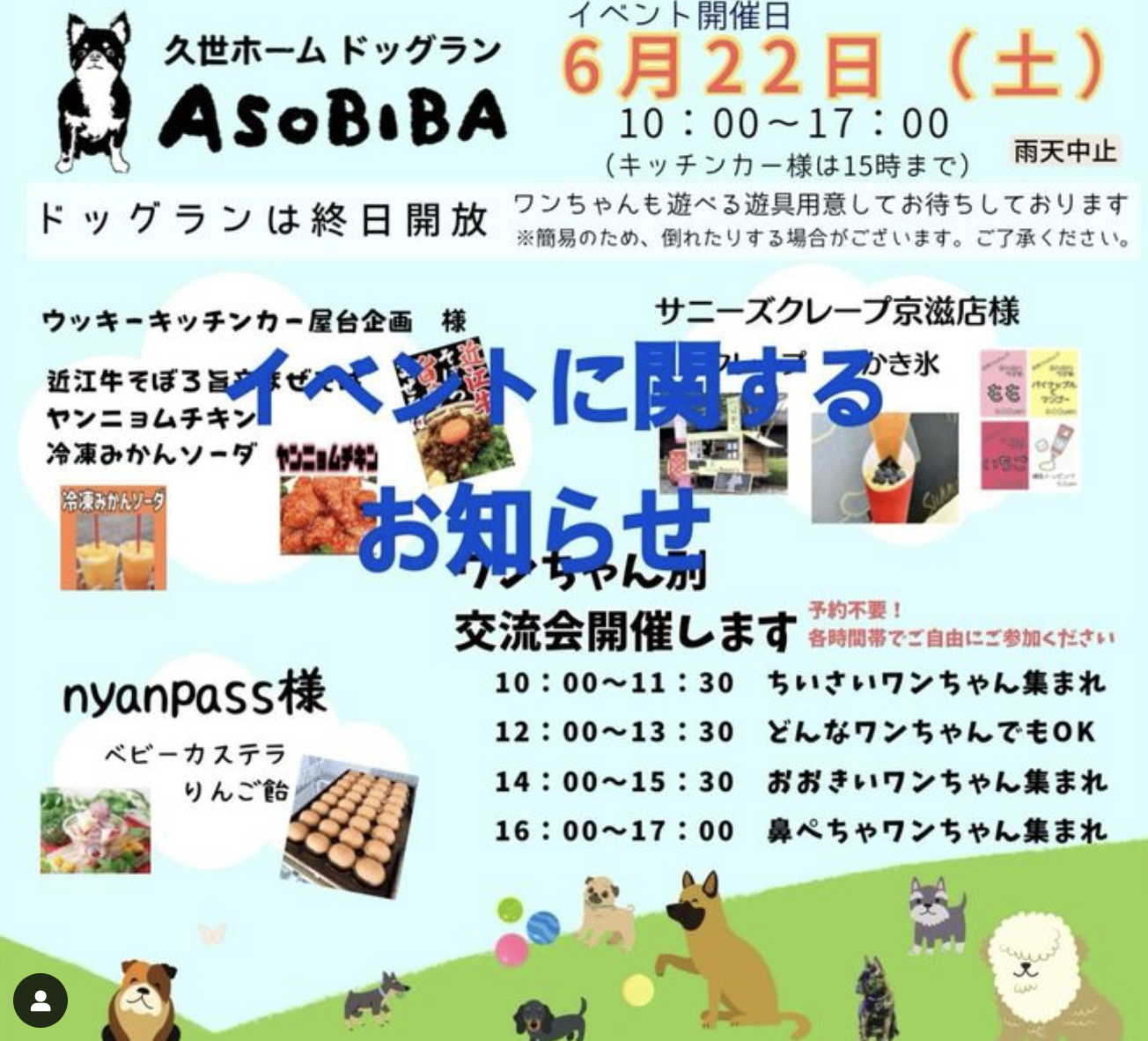 久世ホームドッグランASOBIBAからのお知らせです📢 6月22日(土)明日のイベントについてです。 雨天中止の判断基準に則り、明日のイベントは中止とさせていただくことになりました🙇🏻♂️ そのため、犬種別交流会及びキッチンカー様による出店はございません🙌 楽しみにして下さっていた方には、残念なお知らせとなり申し訳ありません💦 ドッグランは終日解放しておりますので、明日はご自由にご利用ください✨️ 来月からも、皆様に楽しんでいただけるような企画を計画中ですので、お楽しみに🥰 ================================= 💻HPは【久世ホームドッグラン】で検索💫 プロフィール欄URLからもアクセスできます🤗 @asobiba_kuzeh.dogrun イベントのご案内は久世地域包括支援センター @kuze.houkatu ホームページにも掲載しています🎉 🐶ご利用予約•会員登録は☎️075-933-5787にお電話もしくは、直接久世ホームまでお越しください🐶 #京都市 #南区#社会福祉法人清和園#久世 #犬種別 #交流会 #クレープ #かき氷#🍧 #スイーツ #フルーツ#キッチンカー #お店 #ワンちゃん#野菜 #販売 #出店 #出店者募集中 #地域包括支援センター #コラボ #つながり #食べ物 #ご飯 #デザート #メッセージ #お待ちしています #イベント #企画 #seiwaen_promotion