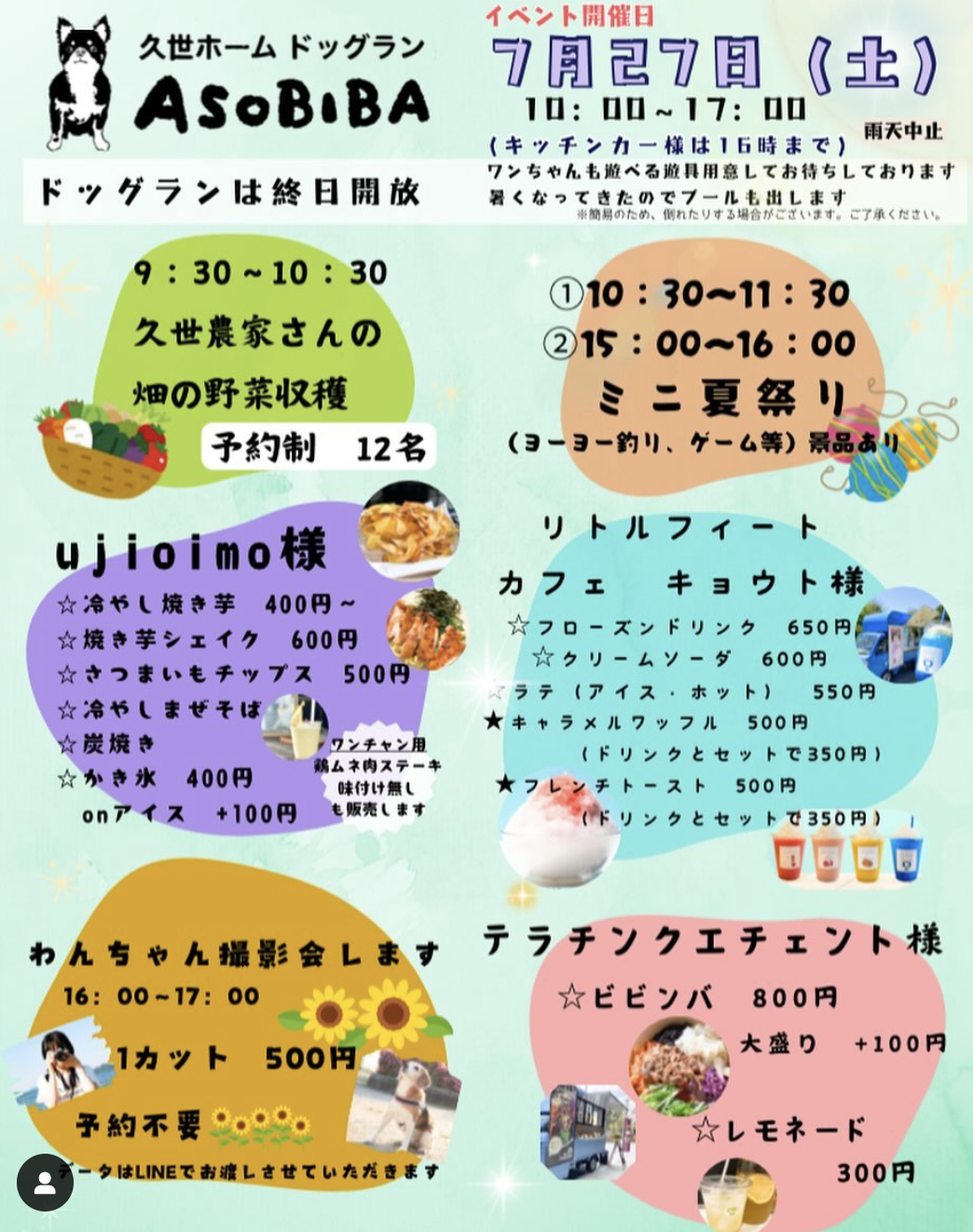 久世ホームドッグランASOBIBAからのお知らせです💭 今月は7月27日(土)にイベント開催いたします🪇 久世農家さんの「野菜収穫」&ミニ夏祭りを実施予定です✨ ★久世農家さんの「野菜収穫」 9:30〜10:30 定員12名の予約制となっており、予約枠残りわずかです😳 ★ミニ夏祭り 10:30〜11:30/15:00〜16:00 ※2部制です ヨーヨー釣りやゲーム等ができます❗️ こちらはご予約は不要ですので、各時間帯でご自由にご参加ください☺️ 今回出店してくださる皆様は...✨ 〈野菜収穫〉 久世の野菜農家 植松様 @yanagiya.uematsu 様 〈キッチンカー〉 つぼ焼き芋SoGa屋様 @ujioimo 様 テラチンクエチェント様 @teracinquecento 様 リトルフィート カフェ キョウト様 @littlefeetcafekyoto 様 ご紹介はこれからしていきますのでお楽しみに🥰 ================================= 💻HPは【久世ホームドッグラン】で検索💫 プロフィール欄URLからもアクセスできます🤗 @asobiba_kuzeh.dogrun イベントのご案内は久世地域包括支援センター @kuze.houkatu ホームページにも掲載しています🎉 🐶ご利用予約•会員登録は☎️075-933-5787にお電話もしくは、直接久世ホームまでお越しください🐶 #京都市 #南区#社会福祉法人清和園#久世 #野菜収穫 #夏祭り #キッチンカー #お店 #ワンちゃん#野菜 #販売 #出店 #出店者募集中 #地域包括支援センター #コラボ #つながり #食べ物 #ご飯 #デザート #メッセージ #お待ちしています #イベント #企画 #seiwaen_promotion