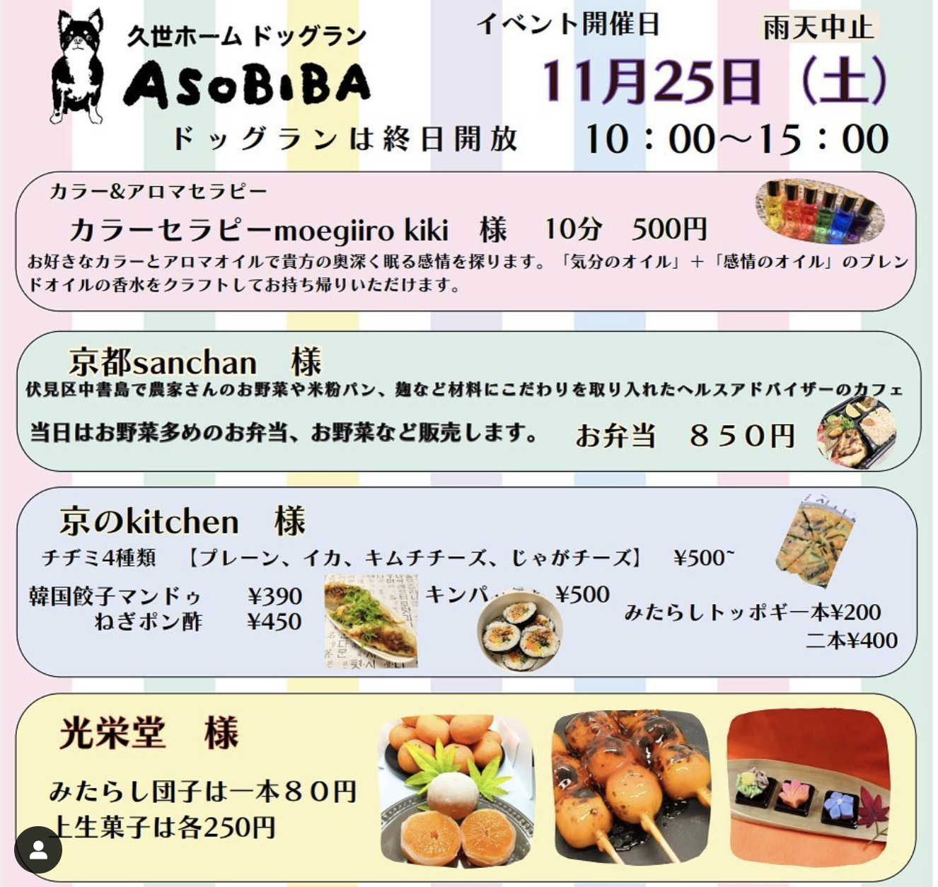 久世ホームドッグランASOBIBAからのお知らせです💭 今月は11月25日(土)にイベントを開催する予定にしています🤭 ドッグランは終日解放なので、ご予約不要です! 今回出店してくださる皆様は...✨ キッチンカー 京のkitchen 様@kyo_kitchen89 様 販売 京都sanchan様@kyoto.sanchan03様 光栄堂様 @kou.eidou 様 カラー&アロマセラピー カラーセラピーmoegiiro kiki様 @moegiiro_kiki 様 ご紹介はこれからしていきますのでお楽しみに☺️ ================================= 💻HPは【久世ホームドッグラン】で検索💫 プロフィール欄URLからもアクセスできます🤗 @asobiba_kuzeh.dogrun イベントのご案内は久世地域包括支援センター @kuze.houkatu ホームページにも掲載しています🎉 🐶ご利用予約•会員登録は☎️075-933-5787にお電話もしくは、直接久世ホームまでお越しください🐶