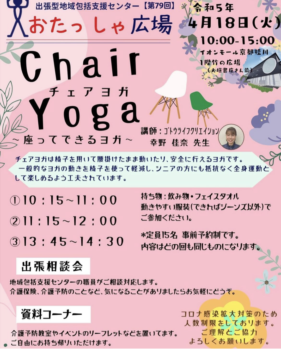 今月の出張型地域包括支援センター「おたっしゃ広場」は4月18日(火)に行われます🙌 今回の内容はゴトウライフクリエイション @gotolifecreation の幸野先生にチェアヨガをして頂きます☺️ 座って行うヨガですので、どなたでも気軽に体を動かすことができます🍀*゜ 事前予約制となりますので、参加希望の方は久世包括までご連絡ください🤗 沢山のご参加お待ちしております🥰 #おたっしゃ広場 #イオンモール京都桂川 #イオン #京都 #桂川 #イベント #ゴトウライフクリエイション #チェアヨガ #ヨガ #運動 #予約#春 #桜 #チェアヨガ #ヨガ #久世包括 #インスタ企画 #介護 #認知症 #若年性認知症 #在宅介護 #介護予防 #看護師 #保健師 #主任介護支援専門員 #介護支援専門員 #ケアマネ #社会福祉法人清和園 #在宅特養