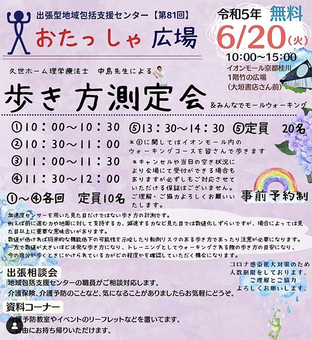 今月の出張型地域包括支援センターおたっしゃ広場は、6月20日(火)に開催いたします!🎊 毎回大好評の久世ホームデイサービスセンター @kuze.day 中島理学療法士による @nakajima.m05 歩き方測定会です👣 午前中は個別の歩き方測定会、午後からはモールウォーキングとしてみんなでイオンモールを歩きます🏃♀️ 今のあなたの歩き方にどんな特徴があるのか、数値として確認してみませんか?👀 予約枠が空いている時間帯もありますので、気になる方はぜひ、久世包括までご連絡ください💓 沢山のご参加待ちしております!!🥰 #京都市南区#地域包括支援センター#おたっしゃ広場 #イオンモール京都桂川 #イオン #京都 #桂川 #イベント#健康づくり#健康教室 #理学療法士 #シニア #久世包括 #久世デイサービスセンター #インスタ企画 #介護 #認知症 #若年性認知症 #在宅介護 #介護予防 #看護師 #保健師 #主任介護支援専門員 #社会福祉士#介護支援専門員 #ケアマネ #社会福祉法人清和園 #在宅特養#seiwaen_promotion