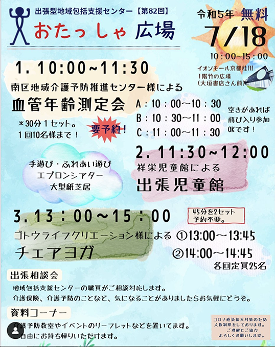 今月の出張型地域包括支援センターおたっしゃ広場は、7月18日(火)に開催いたします!🎉 今回は様々な方と協働いたします✨ ☆10:00〜11:30 南区地域介護予防推進センター様による「血管年齢測定会」 3部制 予約🈵 ☆11:30〜12:00 祥栄児童館によるエプロンシアター・大型紙芝居 ☆13:00〜15:00 ゴトウライフクリエーション様による「チェアヨガ」 2部制 定員25名 好評の血管年齢測定はすでに予約がいっぱいです!ありがとうございます😆😆 当日は、祥栄児童館の子どもたちと遊びませんか?? チェアヨガは予約不要で、来ていただい方から先着順でご参加いただけます🤗 沢山のご参加待ちしております!!🥰 #京都市南区#地域包括支援センター#おたっしゃ広場 #イオンモール京都桂川 #イオン #介護予防推進センター #ゴトウライフクリエーション #京都 #桂川 #イベント#健康づくり#健康教室 #チェアヨガ #児童館 #シニア #インスタ企画 #介護 #認知症 #若年性認知症 #在宅介護 #介護予防 #看護師 #保健師 #主任介護支援専門員 #社会福祉士#介護支援専門員 #ケアマネ #社会福祉法人清和園 #在宅特養#seiwaen_promotion