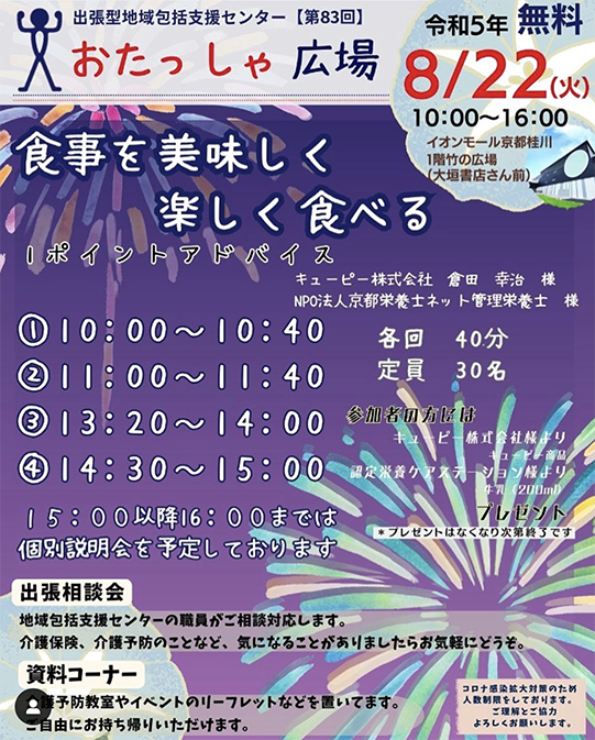今月の出張型地域包括支援センターおたっしゃ広場は、8月22日(火)に開催いたします🥳 今回は、コロナが緩和され、予約制ではなく先着順で参加していただけます。 8月4日 栄養の日にちなみ、今月は「栄養」をテーマにした講義型のおたっしゃ広場となっております😆 ①10:00〜10:40 ②11:00〜11:40 ③13:20〜14:00 ④14:30〜15:00 ☆講義合間や15:00以降は個別説明会を予定しています♪ 講義はキューピーさんと管理栄養士さんがしてくださいます! また、今回はなんと… 参加者プレゼントがあります!!🙌 ぜひ、桂川イオンまで足を運んでいただけると幸いです! 沢山のご参加待ちしております!!🥰 #京都市南区#地域包括支援センター#おたっしゃ広場 #イオンモール京都桂川 #イオン #京都 #桂川 #イベント #栄養 #食事 #講義 #プレゼント #健康づくり#健康教室 #シニア #インスタ企画 #介護 #認知症 #若年性認知症 #在宅介護 #介護予防 #看護師 #保健師 #主任介護支援専門員 #社会福祉士#介護支援専門員 #ケアマネ #社会福祉法人清和園 #在宅特養#seiwaen_promotion