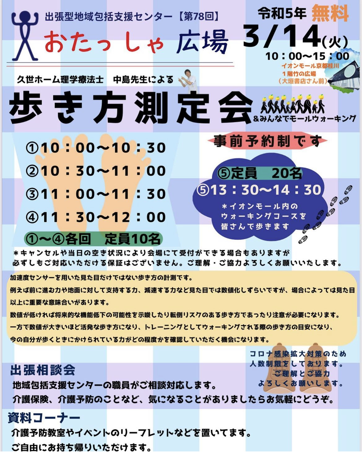 今月の出張型地域包括支援センターおたっしゃ広場は🎊 久世ホームデイサービスセンター @kuze.day 中島理学療法士による @nakajima.m05 歩き方測定👣 午後は、イオンモール京都桂川 @aeonmall_kyotokatsuragawa のウォーキングコースを皆さんと歩きたいと思います☺️💐 お楽しみに🥰‼️ #京都市南区#久世包括#地域包括支援センター#久世包括#出張型地域包括支援センター#おたっしゃ広場#イオンモール京都桂川#竹の広場#歩き方測定#モールウォーキング#久世ホーム#デイサービスセンター#理学療法士#中島基公#ファン多数#介護予防#地域包括ケアシステム#地域福祉#地域づくり#フレイル予防#健康づくり#健康教室#おたっしゃクラブ#社会福祉法人清和園#在宅特養#seiwaen_promotion