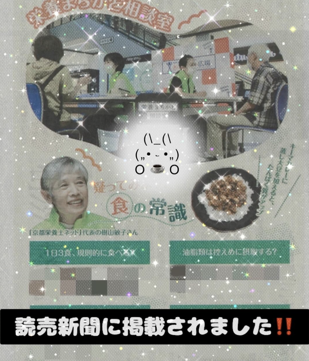 7月18日の読売新聞に掲載されました🎊👏 イオンモール京都桂川にて毎月開催している「出張型地域包括支援センターおたっしゃ広場」でご協力頂いております「NPO法人訪問栄養士ネット」の方より、取り組みを読売新聞に取り上げて頂いたということでご連絡受けました✨ 毎年、訪問栄養士ネット様には栄養・食事から健康につながる講座開催に協力いただいています🤝 ありがとうございます😊 おたっしゃ広場の日の12:00〜13:00に訪問栄養士ネット様の「なんでも栄養相談会」を開催しております♪ 食事・栄養のことなどお困りごとがございましたらお気軽にお声掛けください🤗 今後ともよろしくお願いいたします❗️ ※おたっしゃ広場 桂川イオンにて毎月第3火曜日に開催。 次回は8月20日 テーマ:「食事・栄養」 #読売新聞 #掲載 #今後とも #よろしくお願いします #おたっしゃ広場 #イオンモール京都桂川 #京都 #桂川 #イベント #教室 #栄養 #食事 #インスタ企画 #介護 #認知症 #若年性認知症 #在宅介護 #介護予防 #看護師 #保健師 #主任介護支援専門員 #社会福祉士#介護支援専門員 #ケアマネ #社会福祉法人清和園 #在宅特養#seiwaen_promotion