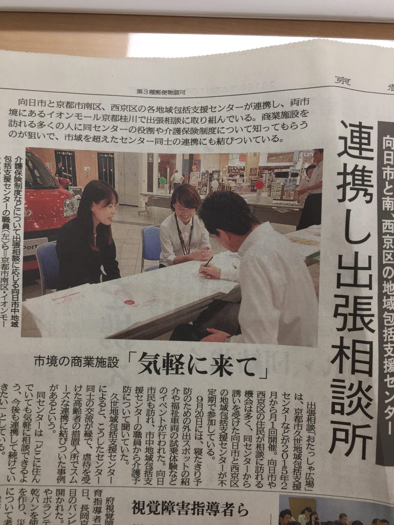 こんにちは、おたっしゃ広場事務局の千木です。 おたっしゃ広場が、10月1日の京都新聞で紹介されました! 平成26年2月からスタートした 「出張型地域包括支援センターおたっしゃ広場」ですが、 2年目となる今年は、「よりたくさんの方に介護予防の啓発を!」と、 企業コラボを積極的に行い、企画の充実を図ってまいりました。 おかげさまで来場者数は昨年を大きく上回り、 たくさんの地域の方とふれあう機会を持つことが出来ています。 おたっしゃ広場は、単なる「イベント」ではありません。 イベントの顔を持ちながら、 地域包括支援センターに求められている役割について、 実はたくさんの要素を含んでいるのです。 ですが、 「より現実的な地域包括ケアシステム」の構築を 目指す私たちにとっては、まだまだ道半ば・・・です。 大きな目標に挑む中で、 ご協力いただいている方々への日頃の感謝を忘れずに 前に進みたいと思います! 今後ともどうぞよろしくお願いいたします。 京都市南区の介護・介護予防の市民相談窓口 出張型地域包括支援センター おたっしゃ広場