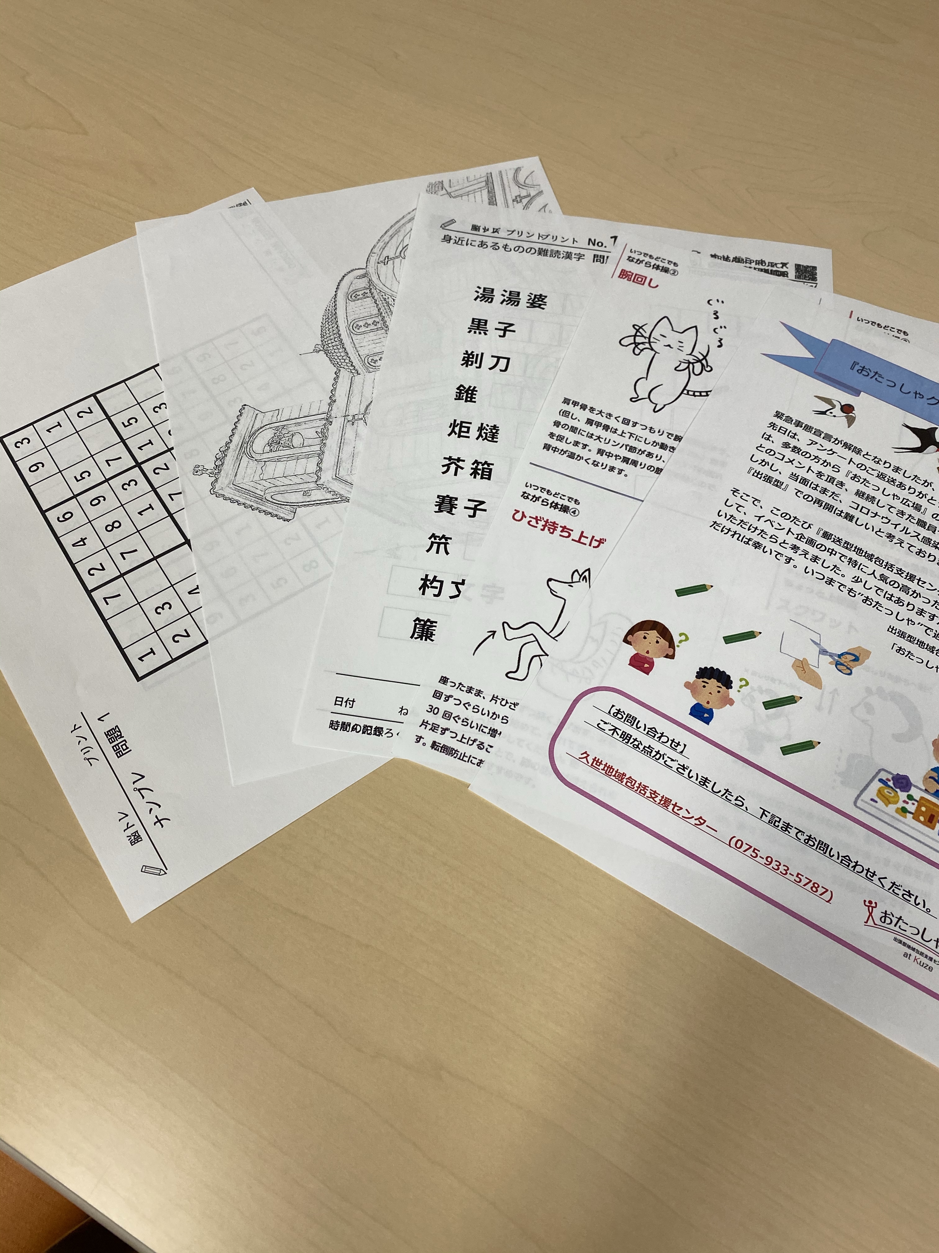 塗り絵や漢字、体操やナンプレ、工作などの「おたっしゃキット」を郵送いたしております。