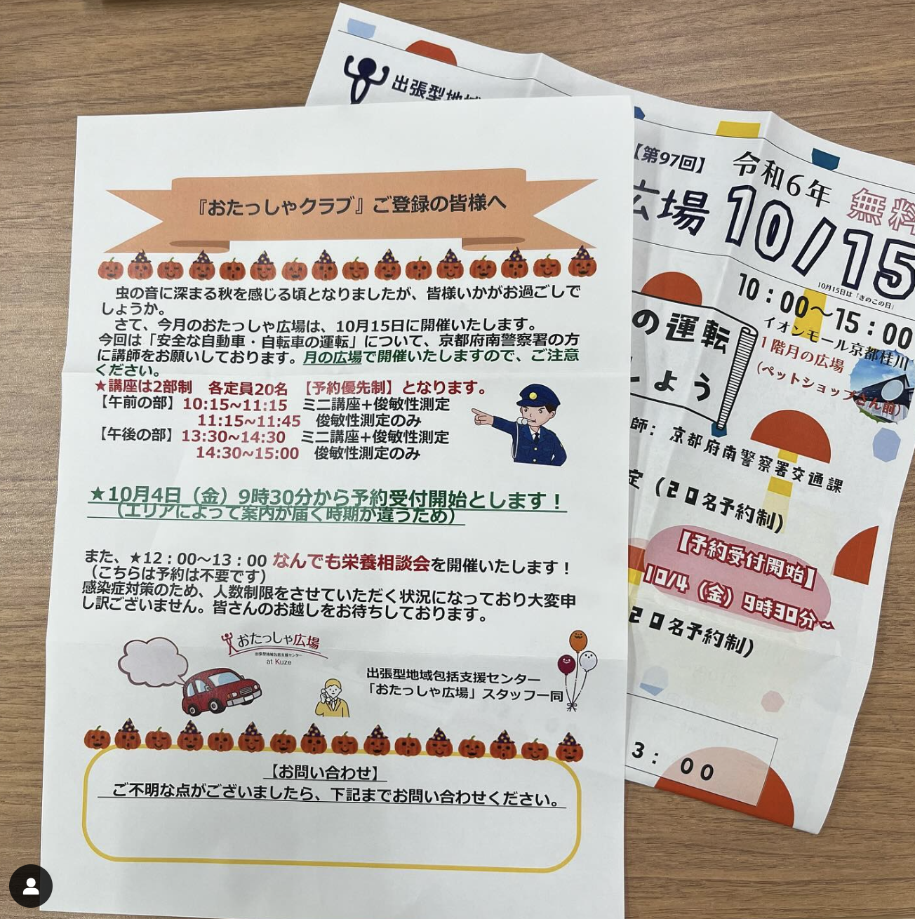 今月も、おたっしゃクラブ会員の皆様へチラシやお手紙の発送準備を行っています😊 今月のおたっしゃ広場は 10月15日(火)に開催いたします🎉 京都市の方には、 ①おたっしゃ広場のチラシ ②職員からのお手紙 ③久世西老人福祉センターの予定表 を同封しています📮 京都市以外の方には、 ①おたっしゃ広場のチラシ ②職員からのお手紙 を同封しております📫 今回のお手紙は、先月社会福祉士の実習に来てくださっていた学生さんに作成していただきました🥰 詳細は、また後日お知らせしますのでお楽しみに✨️ #おたっしゃクラブ #郵送 #お手紙 #チラシ #イオンモール #予定表 #案内 #準備 #安全運転 #俊敏性#測定 #栄養相談 #久世包括 #インスタ企画 #介護 #認知症 #若年性認知症 #在宅介護 #介護予防 #看護師 #保健師 #社会福祉士#主任介護支援専門員 #介護支援専門員 #ケアマネ #社会福祉法人清和園 #在宅特養#seiwaen_promotion
