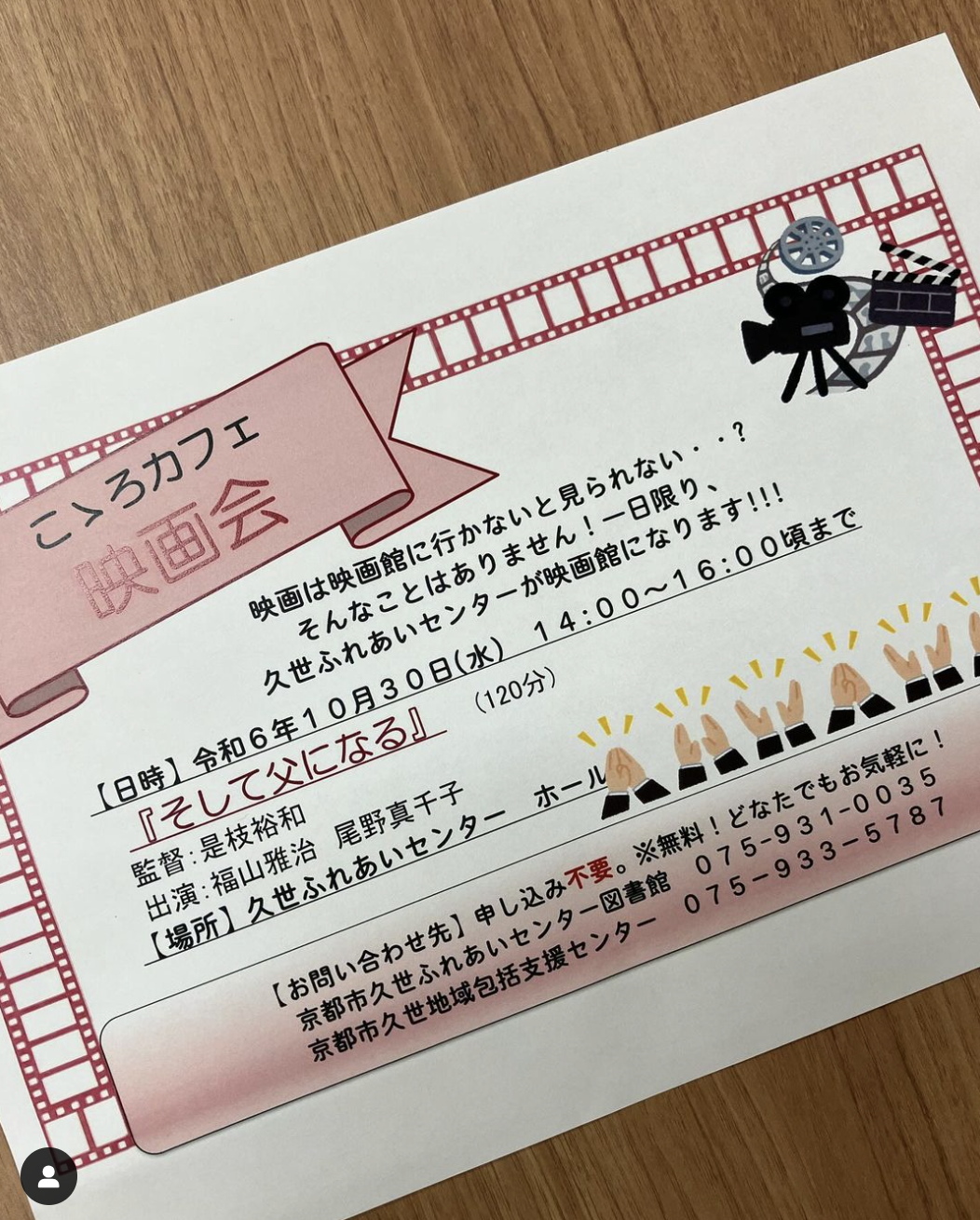 映画会のお知らせです📢 10月30日(水)に京都市久世ふれあいセンター図書館にて映画会を開催します🎉 「そして父になる」を観ていただけます🤗 料金などはいただきません🙅♀️ 14:00〜の上映になりますので、お時間までにお越しください❗️ 皆様のお越しをお待ちしております♪ #京都市南区 #ふれあいセンター #映画 #お待ちしております #久世包括 #インスタ企画 #介護 #認知症 #若年性認知症 #在宅介護 #介護予防 #看護師 #保健師 #社会福祉士#主任介護支援専門員 #介護支援専門員 #ケアマネ #社会福祉法人清和園 #在宅特養#seiwaen_promotion