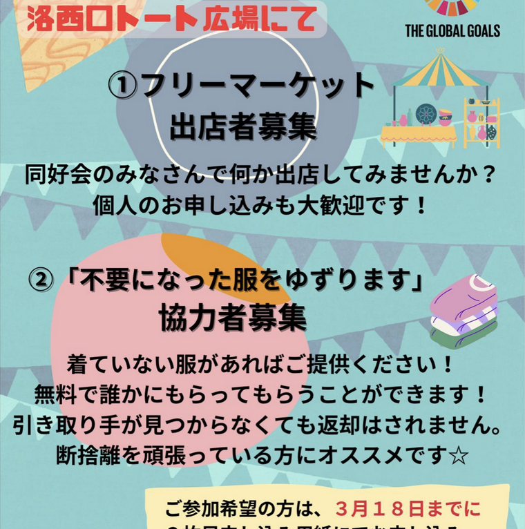 4月8日(土)、トートの文化祭に参加させていただきます💐 地域の皆様で、フリーマーケットの出店、着なくなった服をゆずりますブースに服の提供を頂ける方を募集します🍀 詳細は、久世包括 千木(せんぎ)まで☎️ よろしくお願い申し上げます☺️ #京都市南区#地域包括支援センター#久世包括#洛西口トート#トートの文化祭#地域福祉#sdgs #フリーマーケット#着なくなった服 #リユース#シニアの活躍応援#久世西老人福祉センター#輝けシニア#地域づくり#地域包括ケアシステム#アフターコロナを考える #ネットワークづくり#社会福祉法人清和園#在宅特養#seiwaen_promotion