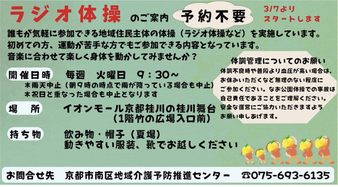 お知らせです⋆͛📢⋆ 3月7日から毎週火曜日の9:30~イオンモール京都桂川の桂川舞台(1階の広場入口前)にてラジオ体操を行います🤸♂️ 予約は不要です‼️ 飲み物・帽子(夏場)・動きやすい服装、靴でお越しください😌 少しずつ暖かくなってきたので、一緒に体を動かしませんか?? 筋肉をほぐしてスッキリと動けるように、一緒に頑張りましょう🍀 体調不良の場合や血圧が高い場合は参加をお控えください🙇♀️ 沢山のご参加、お待ちしています🥰 #地域包括支援センター #介護予防推進センター #京都市 #南区#投稿 #公園体操 #イオンモール #イオン #桂川 #イオンモール桂川 #桂川舞台 #ラジオ体操#久世包括 #インスタ企画 #介護 #在宅介護 #介護予防 #主任介護支援専門員 #介護支援専門員 #看護師 #社会福祉士 #ケアマネ #社会福祉法人清和園 #在宅特養 #seiwaen_promotion