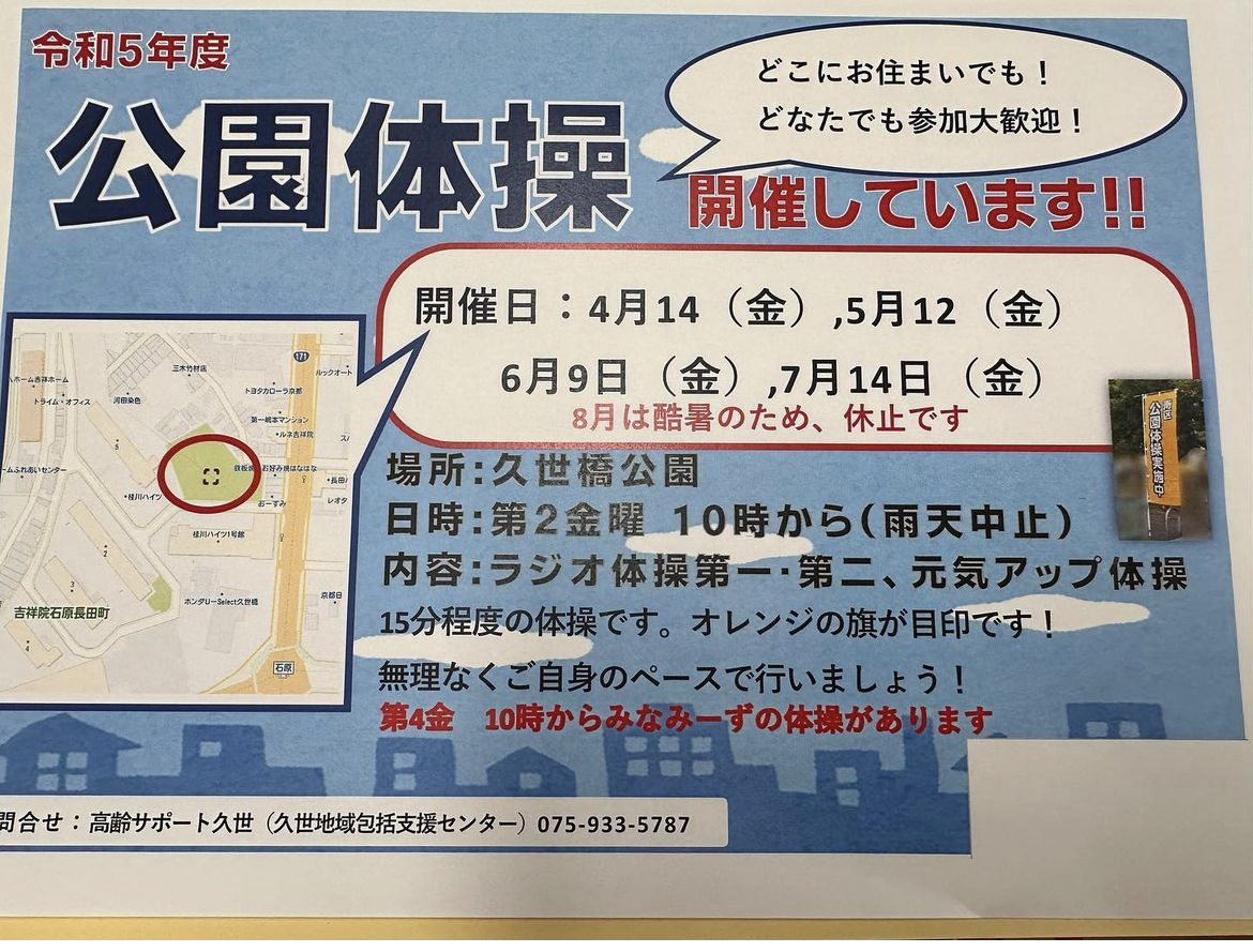 久世包括からのお知らせ⋆͛📢⋆ 今年度もにあっという間に終わってしまいますが、来年度も祥栄学区で引き続き公園体操を行います🤸♂️ 来月は4月14日(金) 10時から久世橋公園にて15分ほど行う予定です🤗 雨がふらない限り開催します‼️ 年齢関係なくどの方も参加できますので、お気軽にご参加ください🌱 花粉も飛んでいますが、気温も上がってきているので少しでも体を動かしましょう☺️ たくさんのご参加お待ちしております!!! #公園 #体操 #公園体操 #ラジオ体操 #第一 #第二 #元気アップ体操 #桂川 #桂川ハイツ #民生委員 #老人福祉委員 #ボランティア #春 #今年度 #次年度#久世包括 #インスタ企画 #介護 #認知症 #在宅介護 #介護予防 #看護師 #保健師 #主任介護支援専門員 #介護支援専門員 #ケアマネ #社会福祉法人清和園 #在宅特養